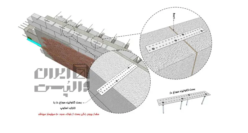 – تسمههای اتصال معمولاً از هر 2 یا 3 رج در میان در ارتفاع دیوار استفاده میشود که همگام با اجرای بستهای ارتجاعی برای دیوار داخلی یا خارجی میباشد.